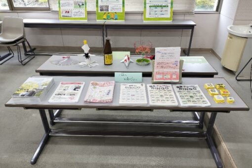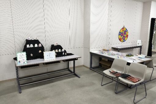会場の一画では、学生作成の学科紹介パネルや顔出しパネル、2年生の平松拓巳さんの手芸作品、岩崎准教授が学生と協力して作った方言パズルや方言シールなどの展示を行いました。