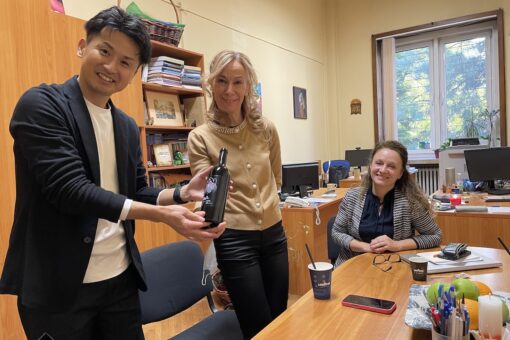 エラスムス・プラス教員交流プログラムの担当副学部長のビストラ・ミゾヴァ先生にも福山大学「さくら」ワインを贈呈させて頂きました