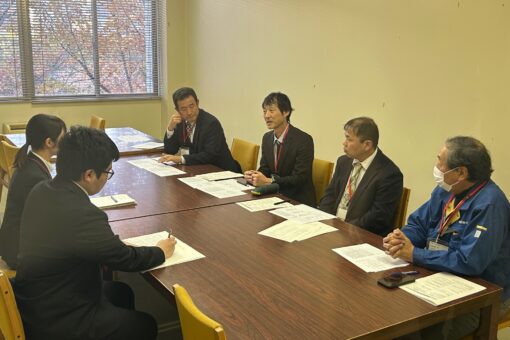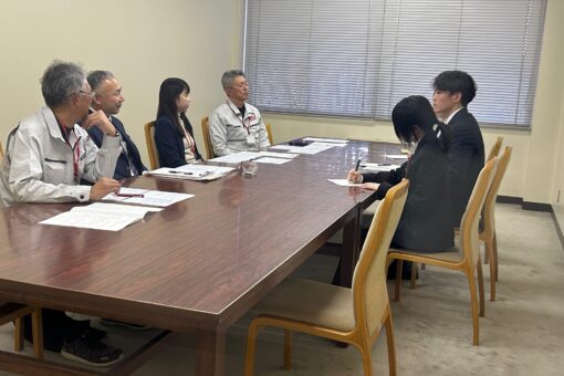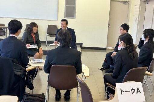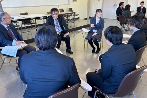 入社2年目の(株)オーザックの高橋未来さんと、今年入社した(有)三愛機工のKさん(いずれも人間文化学科卒)を中心に、経営者の皆さんも交えて仕事の選び方や就活の進め方、面接対策など、先輩の体験談と経営者のアドバイスの両面から話が広がっていきました。