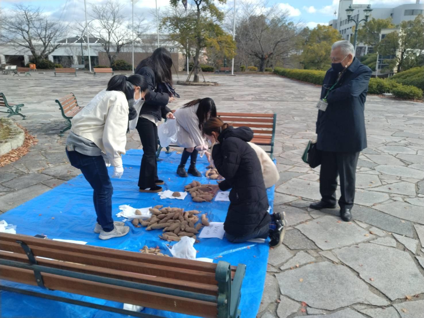 学長から一言:JR松永駅前の活性化を目指すプロジェクトMの皆さんが大学の畑で大事に育てたサツマイモをキャンパス内で販売するのが、すっかり恒例行事になってしまったようです。栽培に適した土壌作りから始めて、皆さんの奮闘努力の作品「紅はるか」がたくさん育ち、良かったですね。購入のために立ち寄った学生や教職員の皆さんも大喜びだったことでしょう。