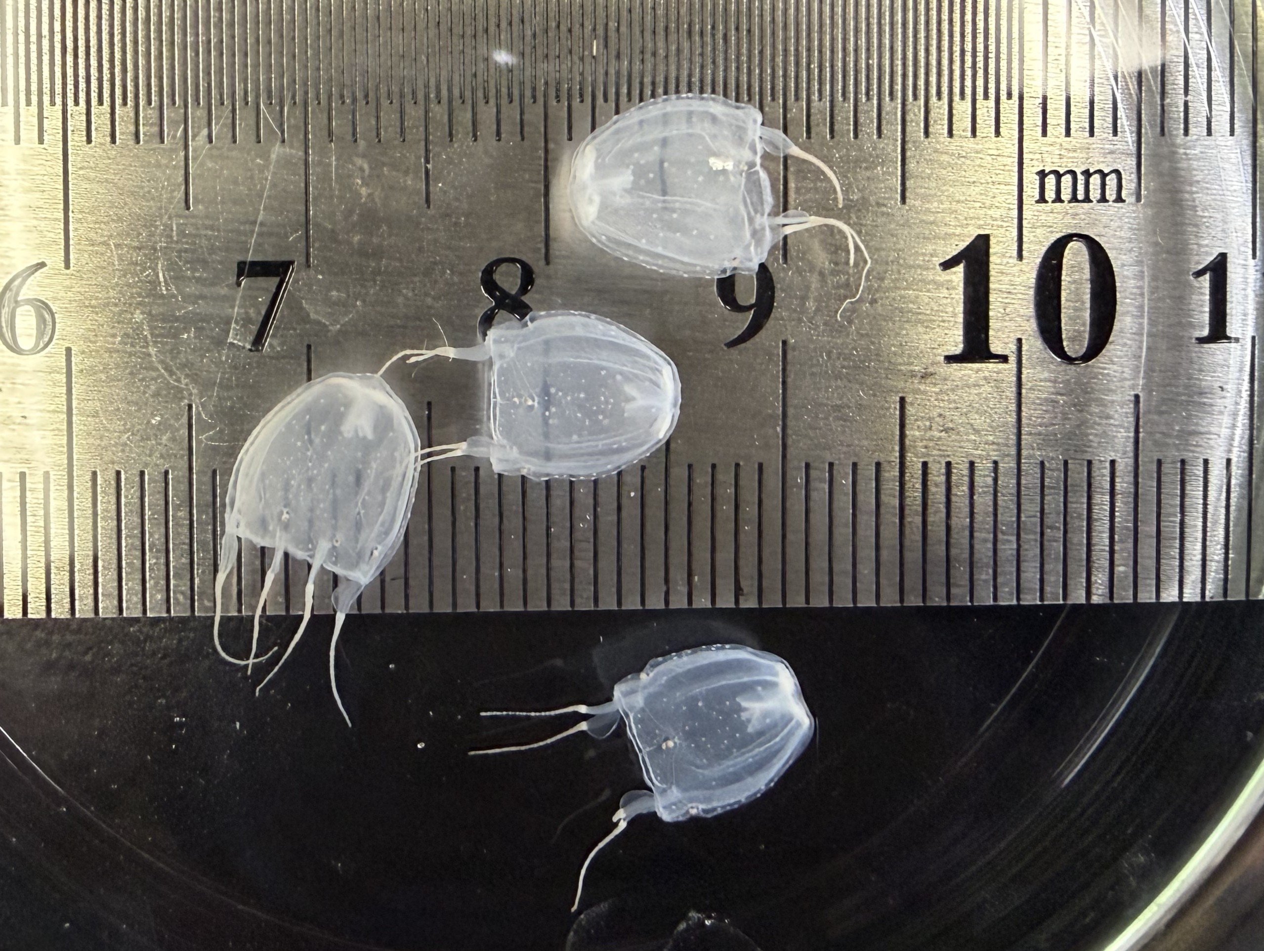 傘の大きさが5 mm程度の稚クラゲです。ここまでは比較的簡単に育成できるようになりました。