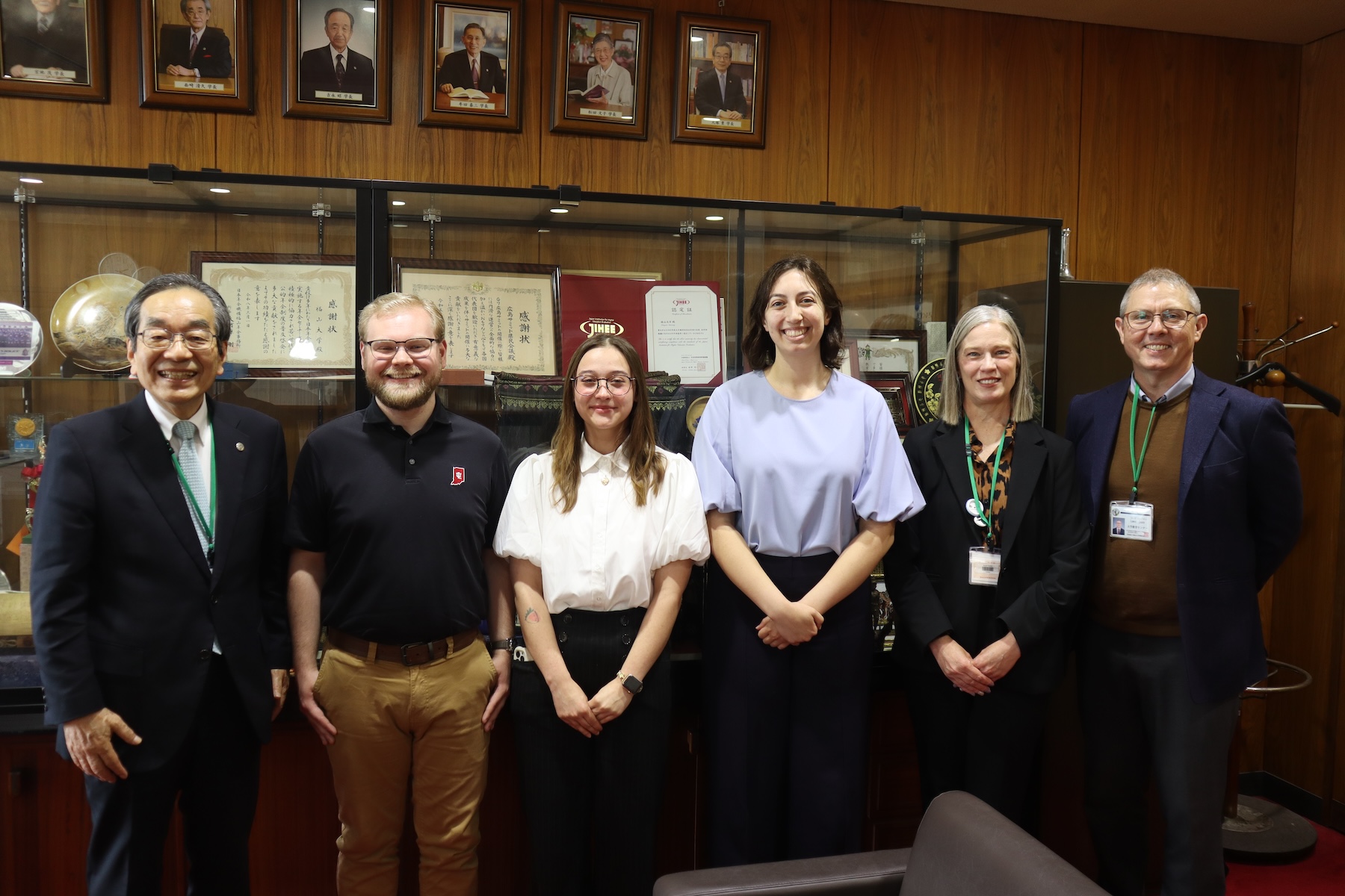 学長から一言:英語教育のTAとして研修中のアメリカからの大学生3人、ジョーイ・ウーリーさん、サラ・ジョイスさん、ミア・トンプソンさん、ようこそ福山大学へ! 本学とインディアナ大学との2014年締結の協定に基づき実施している「グローバル・ゲートウェイズ・プログラム」もすでに12年目。これまで多くに研修生を受け入れました。今年は3人もの受入れですが、全員が日本語の習得者。日本語や日本文化についても、多くの経験を積んで欲しいものです。キャンパスで出会ったら、積極的に声をかけてあげてください。