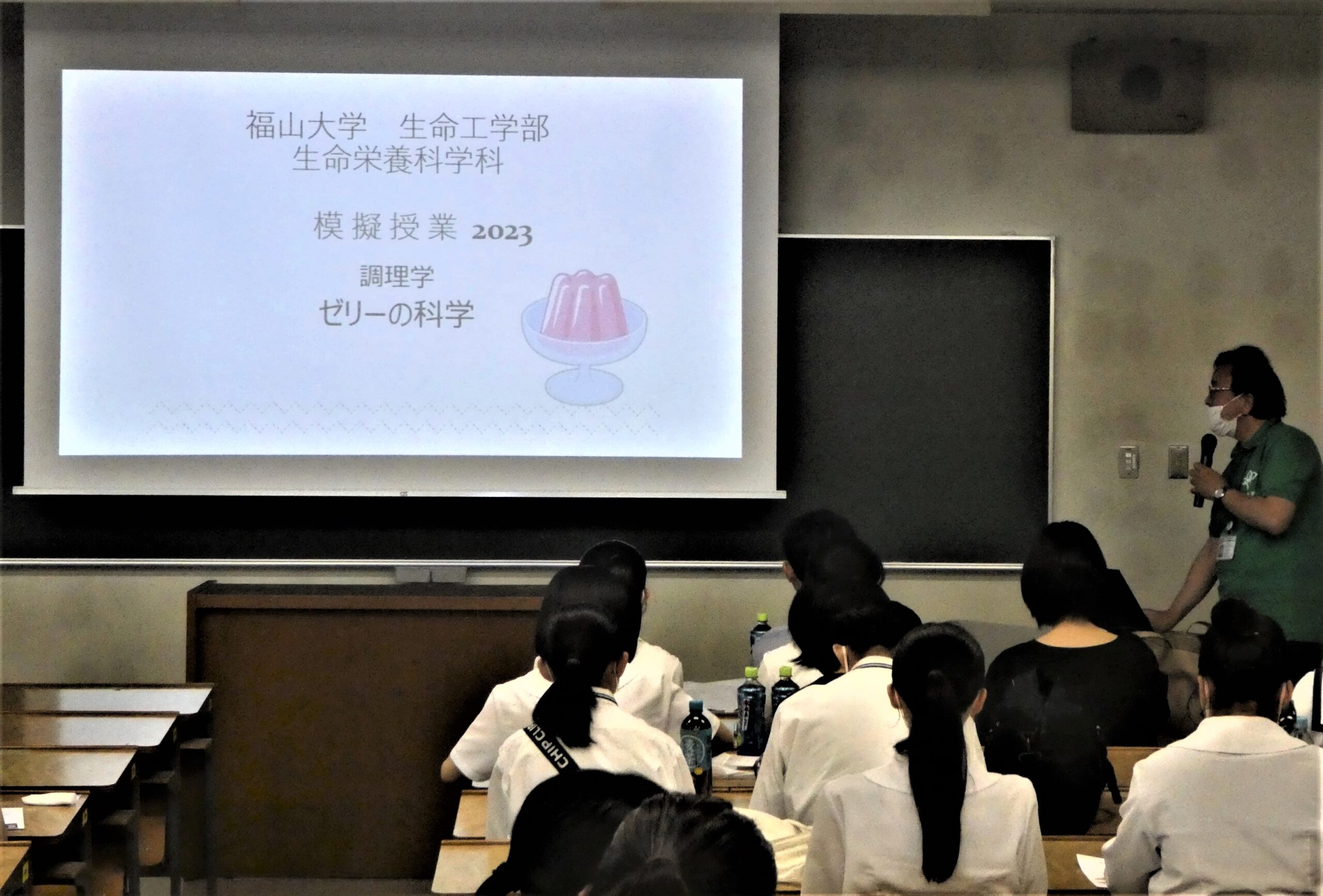 皆さんは、ゼリーは食べたことがありますよね?! 市販されているゼリーは、食品会社がそれぞれ会社の特徴も出して沢山の種類が出回っています。また、凝固剤は食品の粘りを出すために様々な食品(ヨーグルト、お菓子、料理など)に使用されています。今回の実験は、その基礎知識に関する内容でした。さらに、実験の後の講義では、凝固のメカニズムなど食品学の一端を勉強しました。食品学の講義は、井ノ内直良教授が担当しました。