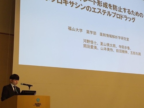 薬学研究科長から一言:パシフィコ横浜で開催された日本薬学会144年会は、すごい人数の研究者や学生が集まり各場所で熱い質疑応答が続く盛り上がった学会でした。その中で、福山大学からも多くの学生が口頭発表やポスター発表を行いました。学生達にとっては自身が行った研究に対して他大学の方に興味を持たれて質問やコメントを頂くことができたのは、今後の研究のモチベーションに繋がることでしょう。そのモチベーションをそのまま維持し熱く研究を進めることで、医療の発展に貢献することを期待します。