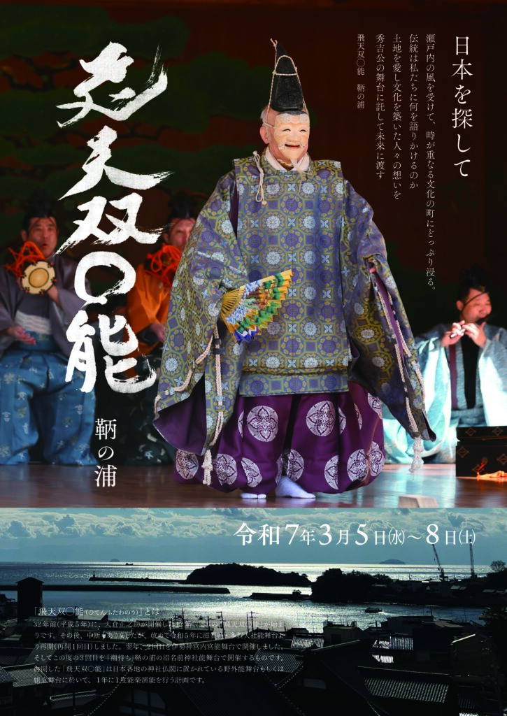 大倉正之助(一般社団法人 令和文化蔵)が主宰する能楽奉納公演「飛天双○能」が鞆の浦沼名前神社能舞台(国の重要文化財)で開催されます。