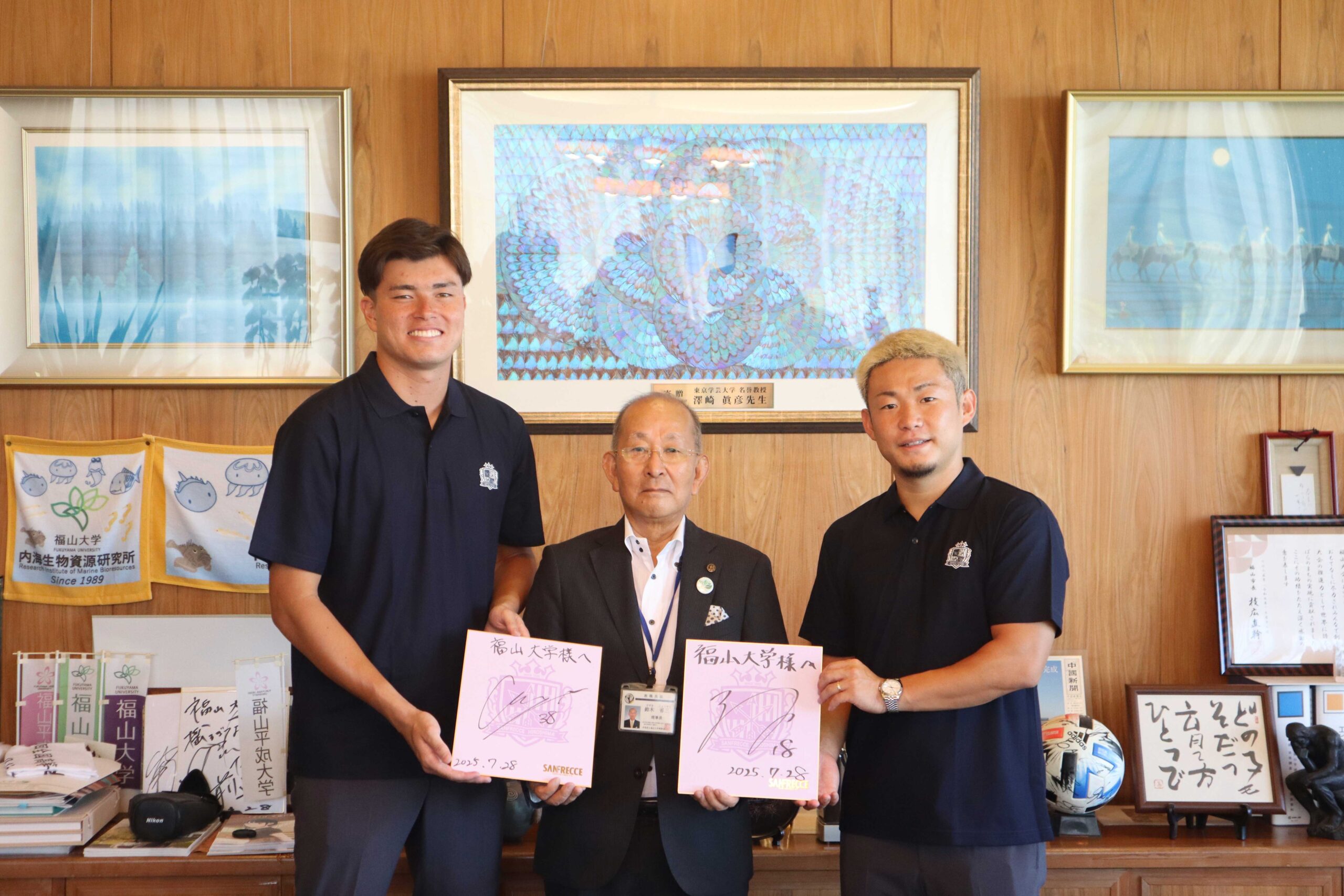 2025年7月28日(月)、Jリーグ・サンフレッチェ広島より、背番号18番の菅選手(MF)、38番のヒル選手(GK)、事業本部の悦喜様が本学を訪問されました。