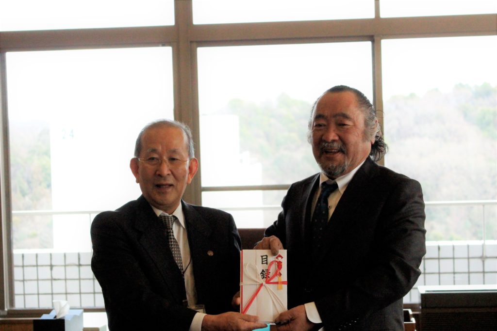2月18日(火)理事長室にて贈呈式が行われ、水田福山大学同窓会連合会長から鈴木理事長に目録が手渡されました。