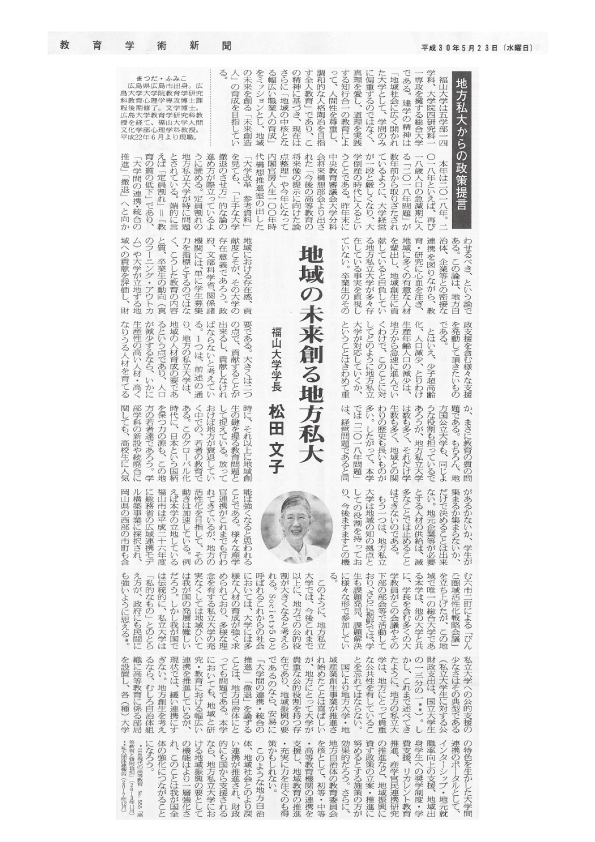 2018.05.29 【ニュース】教育学術新聞へ松田学長の記事が掲載されました。 5月23日の教育学術新聞へ、「地域の未来創る地方私大」というタイトルで松田文子学長の記事が掲載されました。 画像をクリックしてPDFを表示 この記事をシェアする