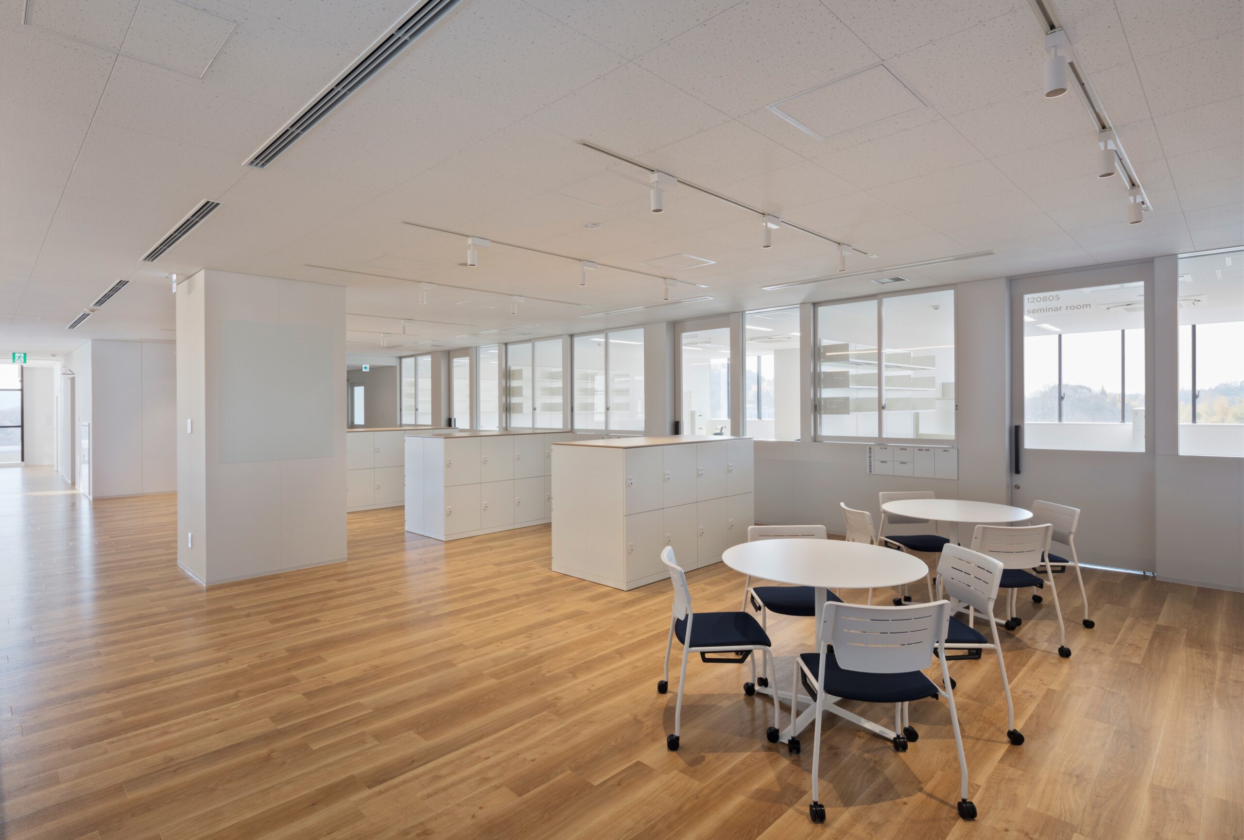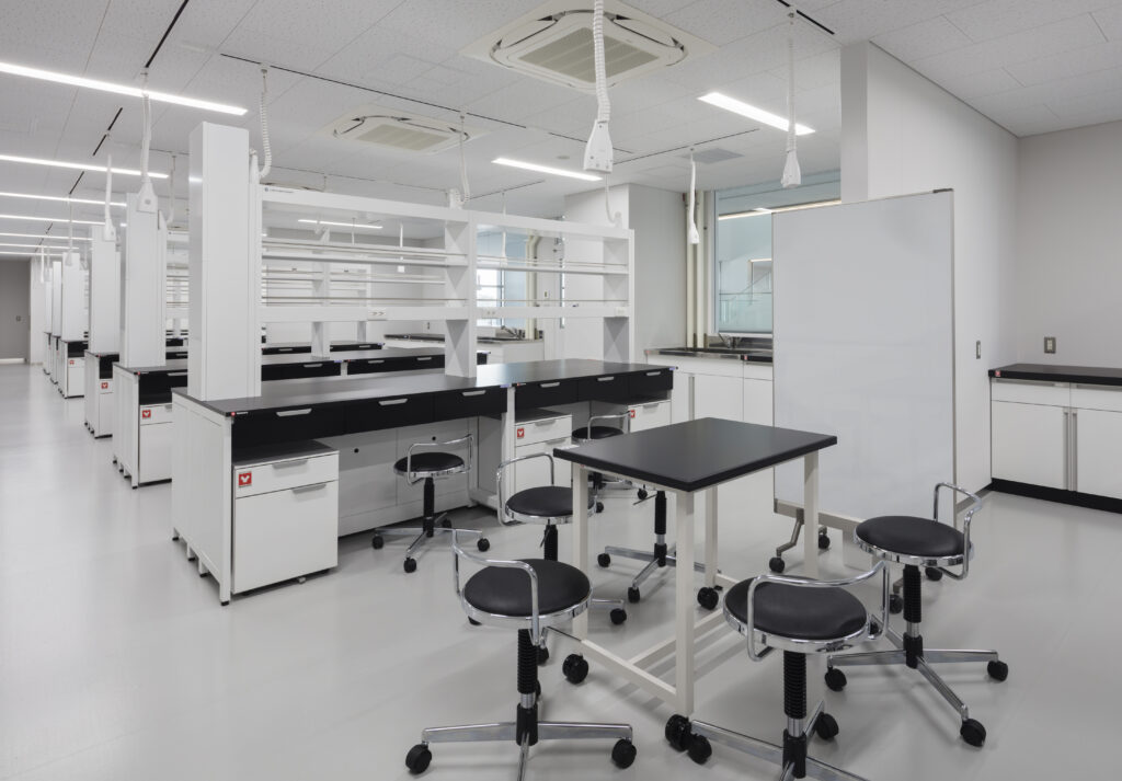 4階から10階までは主に薬学部の実験室や研究室として使用し、これまで旧10・11・12号館にあった薬学部の機能は全て未来創造館に移設しました。3研究室の実験室をオープンエリアとし、研究の技術・知識の交流が活発になるように工夫されており、薬学部研究棟として機能しています。