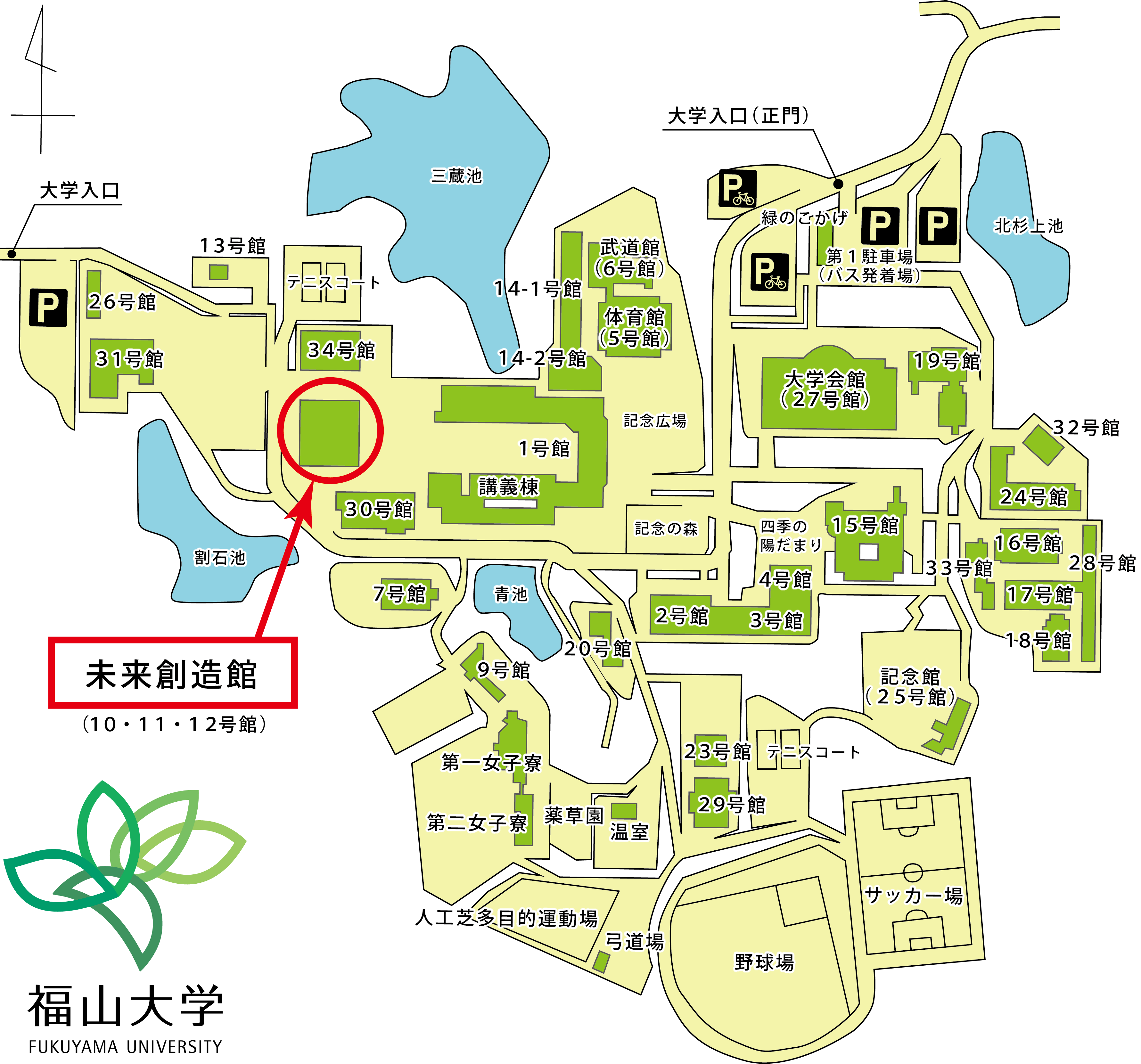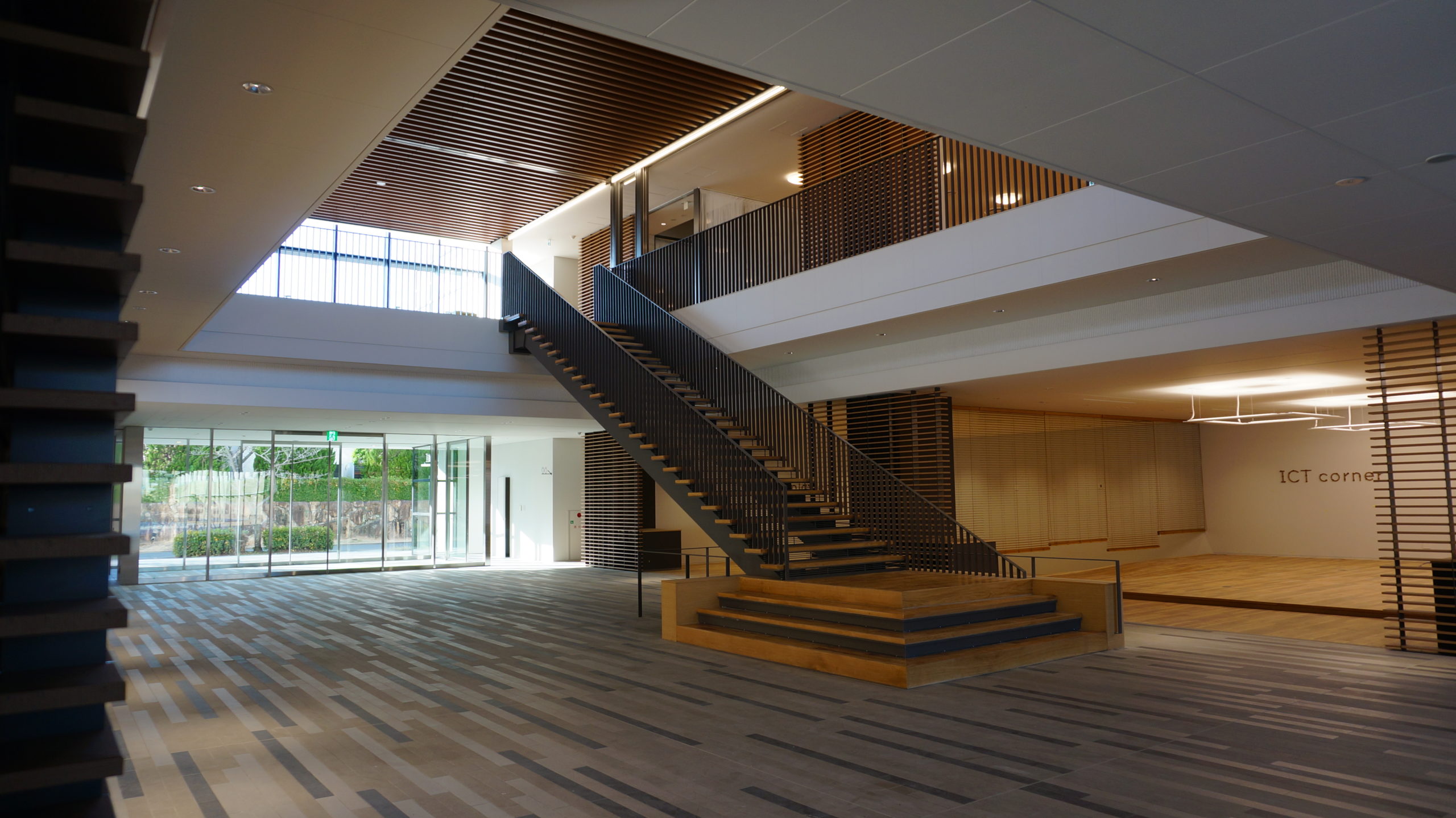 未来創造館は1号館からCROSSING GARDENを通り抜けた正面に建設されました。位置的には34号館(医療薬学教育センター)の南隣にあります。