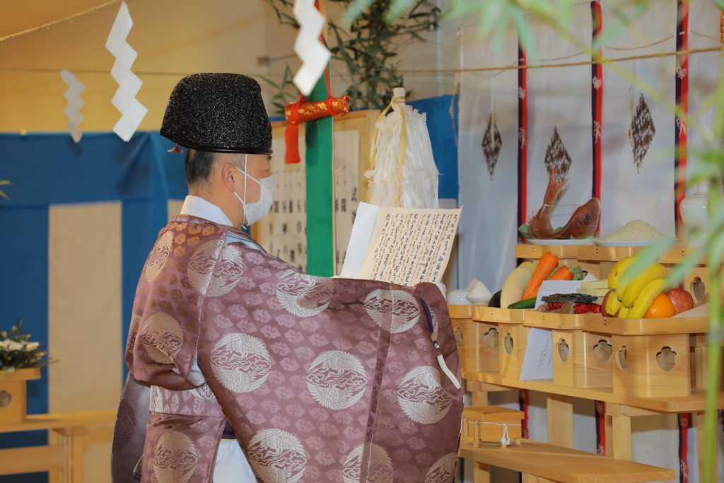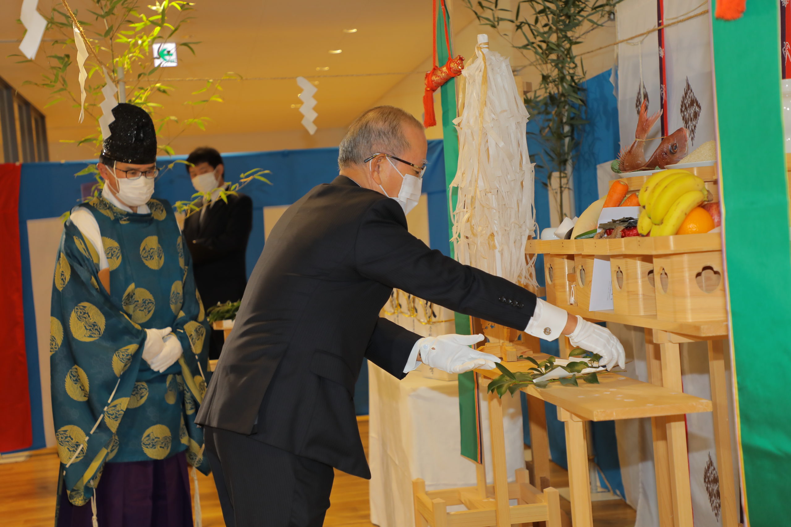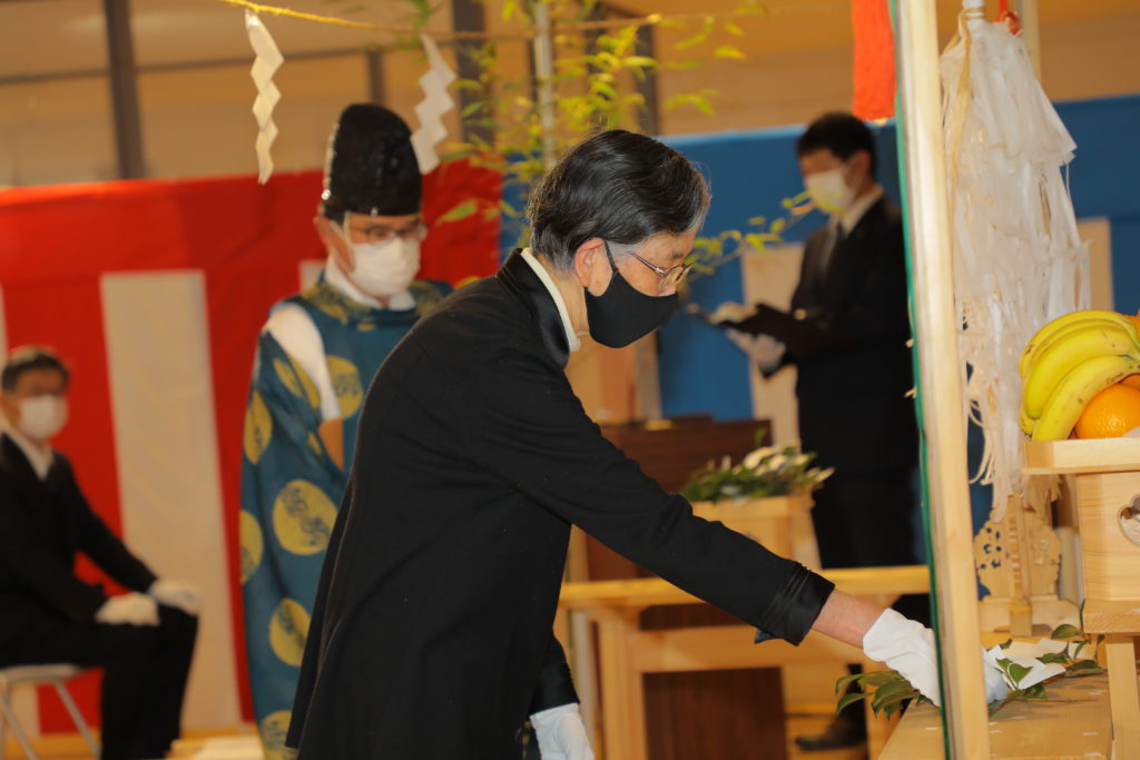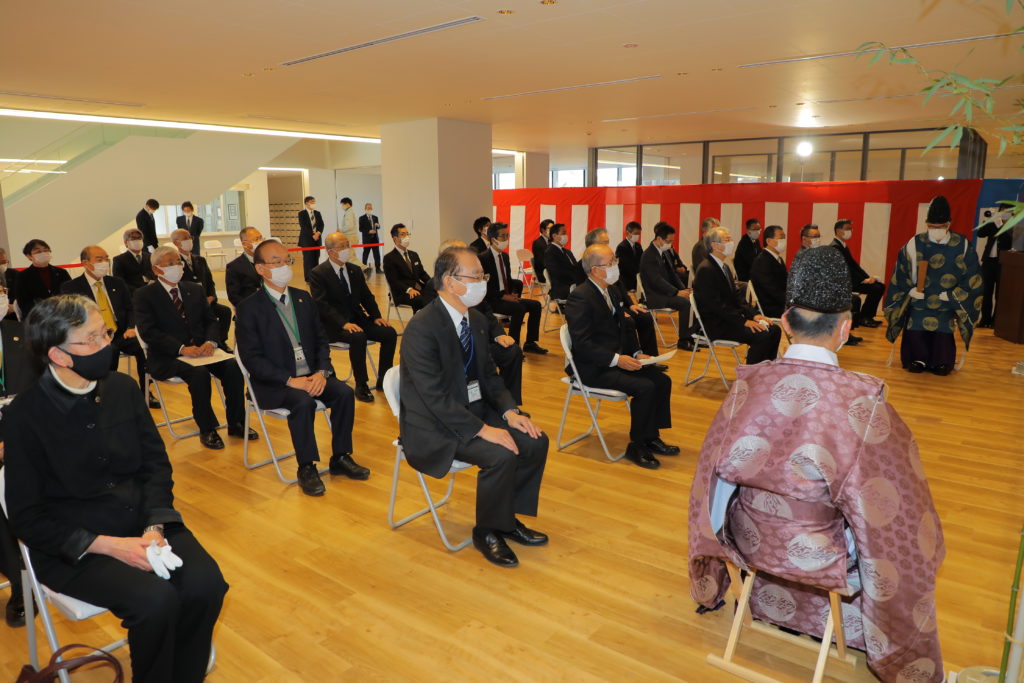 令和2年12月21日(月曜日)10:30より鈴木理事長をはじめ大学関係者、設計事務所及び施工会社出席のもと、地鎮祭、上棟式と同じ、備後一宮吉備津神社宮司を斎主として、滞りなく福山大学未来創造館新築工事の竣工式を執り行いました。