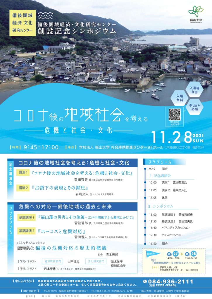 2020年4月、「広く地域社会と連携して活力ある地域づくりに貢献すること、学術・文化振興に資すること」を目的として創設された備後圏域経済・文化研究センターは、その創設を記念し、学内外の専門家や地域の識者を招いて、シンポジウム「コロナ後の地域社会を考える:危機と社会・文化」を開催します。また、新資料の展示を含むセンターの活動(学生の地域活動を含む)の展示を行います。以下、概要についてお知らせします。なお、感染防止対策の面から人数制限を行いますので、事前申し込みが必要です。詳細は、チラシ・センターHPを参照ください。