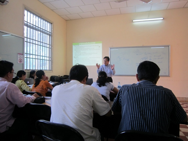 しかし、クメール語には教育学に関しても多くの科学的概念の語彙が存在しません。そこで、授業を担当していた時期に、受講者の協力も得て、日・英・クメールの教育関係語彙集を試作したこともありました。また、私はクメール語などもちろんできるはずもありません。私が英語で行う講義を側でつぶさに通訳してくれたのは、かつて博士課程で指導し、学位取得後に現在カンボジア教育省に勤務するグォン・ソクチェンさんです。私が本務の関係で、年末に10日間もの時間をとることが絶対に無理になって、後ろ髪を引かれる思いで退任した後、この授業の担当を引き継いでくれているのは彼女です。