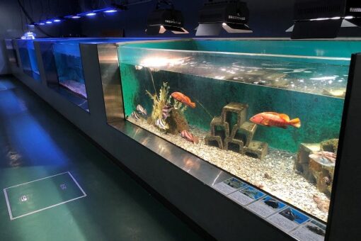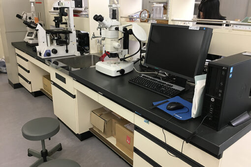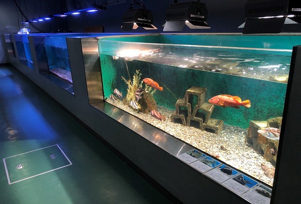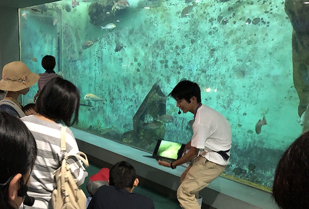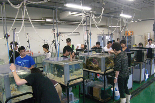 瀬戸内海に面した因島キャンパスには、大学附属のマリンバイオセンター水族館があります。海洋生物科学科の研究室の一つ「アクアリウム科学研究室」では、この水族館施設を活用した卒業研究を行っています。また、1~3年生の各学年で実施される学生実験の一部でも、水族館施設を使用した実習がプログラムされています。また、学芸員養成課程の実習も行います。
