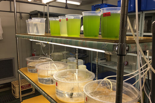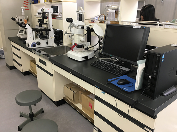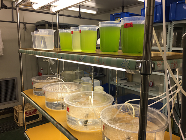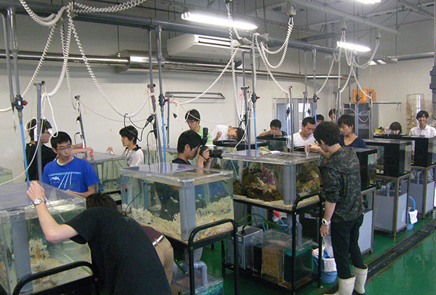 また、因島キャンパスには増養殖施設が完備されており、「沿岸資源培養学研究室」では瀬戸内海の有用魚であるシロギス・キジハタ・オニオコゼなどの増養殖研究を行っています。この施設では、親魚の養成から採卵、仔稚魚から成魚に至るまでの一連の飼育管理が可能です。これらの魚の成体飼育のほかに、餌となる動物プランクトンの培養も卒業研究の一環として行っています。
