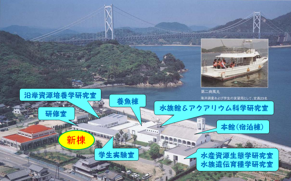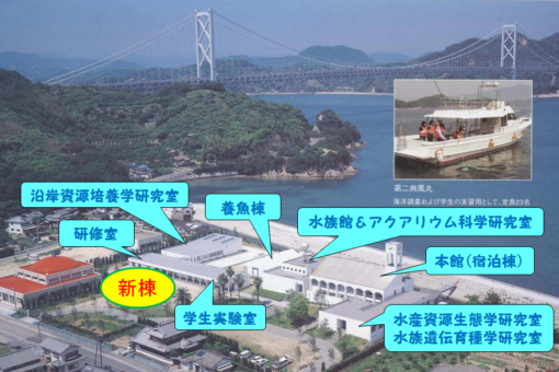 海洋生物科学科は、福山市東村町に在る本学キャンパスと、尾道市因島に在る因島キャンパスで教育・研究活動を行っています。この因島キャンパスに、新たな学舎が加わります。