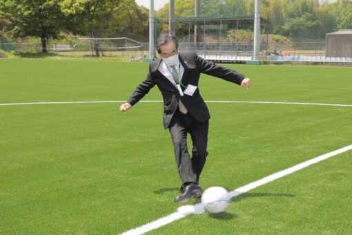 大塚学長にサッカー場中央より人工芝改修後初めてのキックオフをしていただきました。