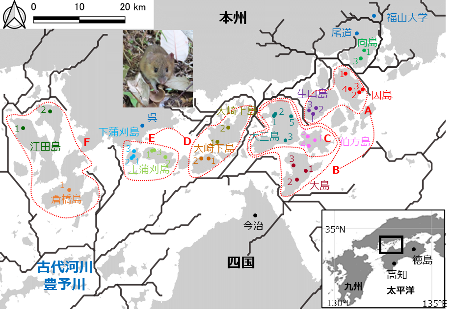 瀬戸内海島嶼に生息するアカネズミ(齧歯目ネズミ科)を対象にゲノム情報の分析を行い、島間のアカネズミの類縁関係を解明した。その結果、約2万年前の氷期に存在した古代河川 豊予川(ほうよがわ)が瀬戸内海の島嶼の形成に大きな影響を与えたことが明らかとなった。