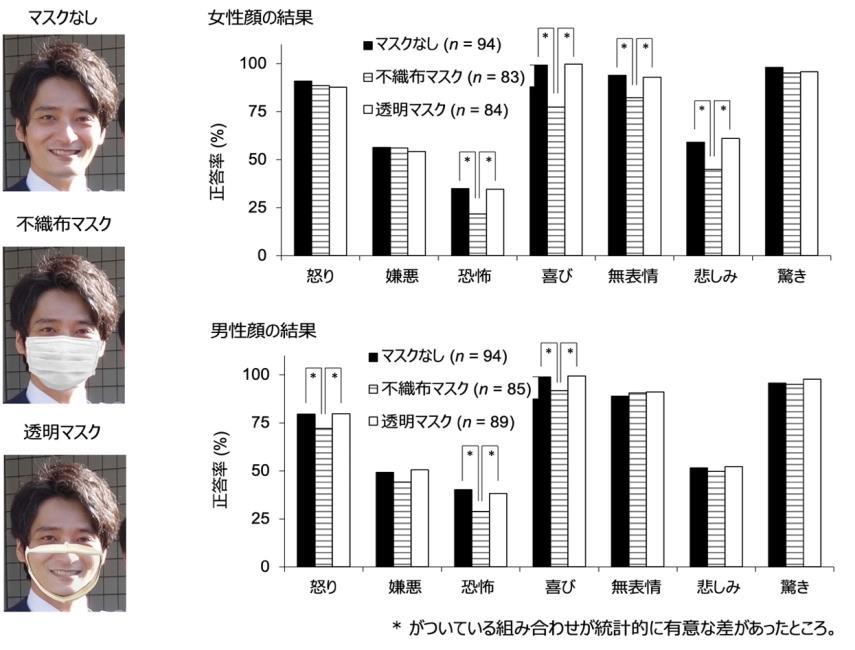 マスクなし、不織布マスク、透明マスク顔の参考画像(左)。表情判断課題の正答率(右)。横軸は浮かべている表情。縦軸は正しく選択できたパーセンテージ。