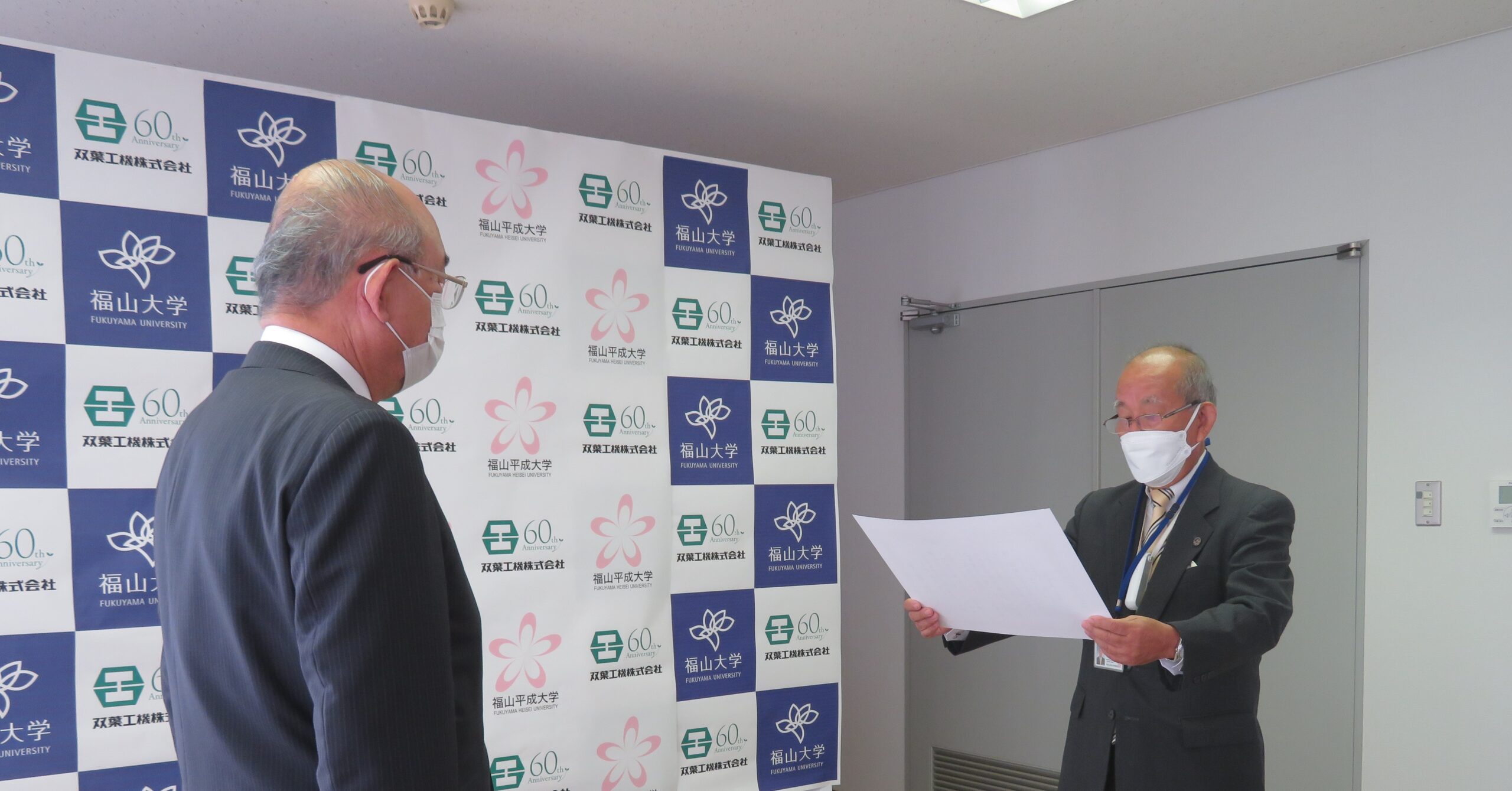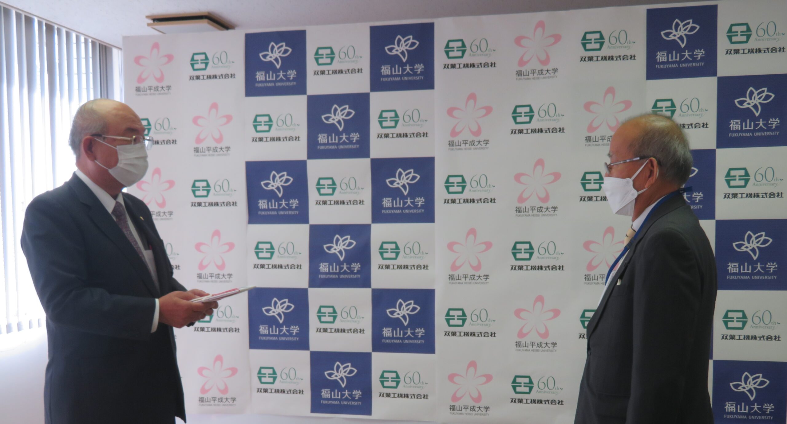双葉工機株式会社は、1961(昭和38)年の創業以来今日迄、ICT関連企業として発展を遂げられ、特に本法人の設置する両大学(福山大学・福山平成大学)における設備整備充実に多大な貢献をいただいております。
