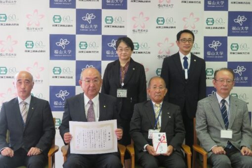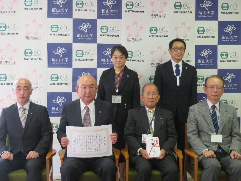 今回の寄付は、会社創立60周年記念に伴う「地域社会の豊かな未来づくり」の取組の一環で、地元福山のお客様への感謝の意を表され、毎年数多くの学生を地元企業等へ輩出する本法人へ教育環境整備の拡充にお役立ていただきたいとの趣旨の申出によるものです。
