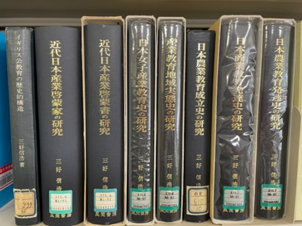 ファーストオーサー、つまり筆頭著者は特別の扱いながら、何人もの研究者による共同執筆がごく当たり前の理系の論文や著書と違い、私自身の分野を含む文系の多くの分野では単著であることが重んじられ、共著論文などは単著ほど価値あると見做されないところがあります。少なくとも私が教育・訓練を受ける中で自然と身に付けてきた印象はそういうものです。文系は研究者個人の深い思索こそが大切で、その結果が論文や書物に結実すると考えられるからかもしれません。しかも、上記の著作群は、そのごく一部を写した次の写真に見られるように、いずれも浩瀚なのです。わずかな単著や個人訳書だけで息切れ状態の私など到底足下にも及びません。就職のために博士課程を1年残して切り上げた私が、後に中国高等教育の原型が形成される過程で内外から受けた影響関係を考察した博論を書き上げ、三好先生にこそ評価してもらいたいと論文博士号の審査の主査をお願いした所以です。