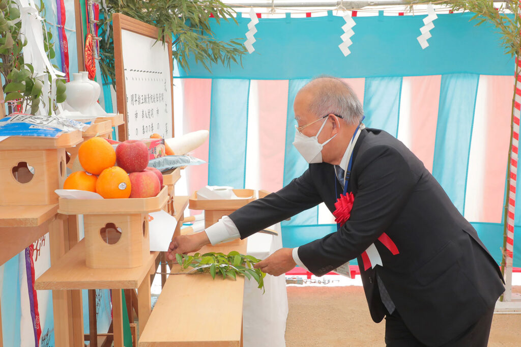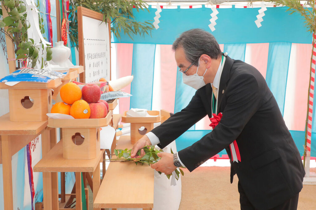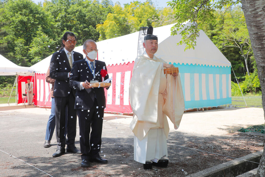 令和6年5月17日(金曜日)10:00より鈴木理事長をはじめ大学関係者、設計会社及び施工会社出席のもと、備後一宮吉備津神社神官を斎主として、滞りなく福山大学聚志館(ものづくり工房)新築工事の安全祈願祭を執り行いました。