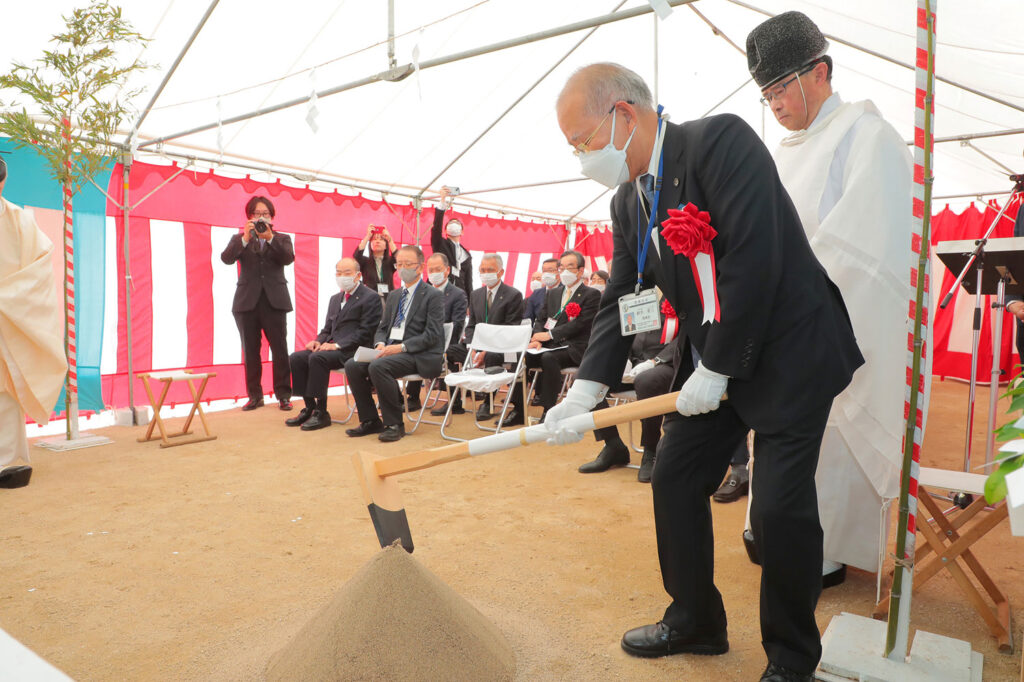 学校法人を代表して、建設予定地に初めての鍬(くわ)入れを行いました。