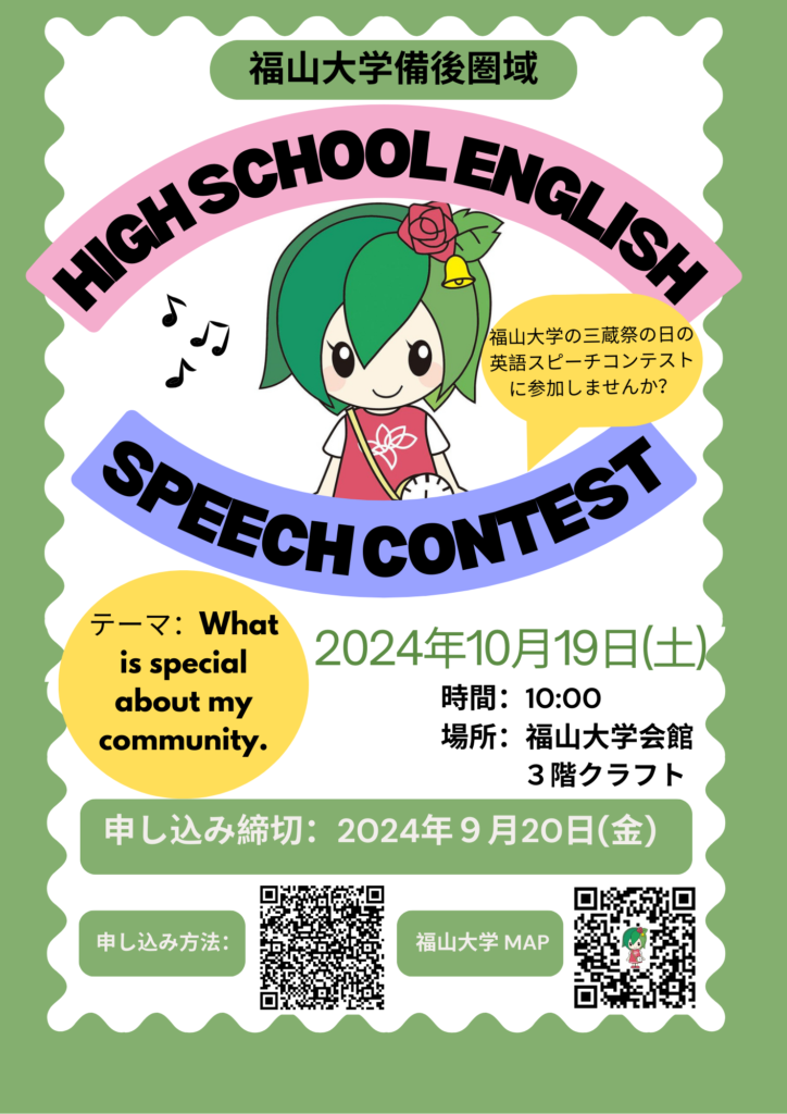 福山大学では、高校生の皆様が国際的な視野と優れた語学力を身に付け、国際社会で活躍できる力を養うための機会として、広島県教育委員会、福山市教育委員会及びふくやま国際交流協会からのご後援、福山商工会議所、福山松永ライオンズクラブ及び松永ロータリークラブからのご協賛のもと、2003年から開催しており、昨年で第20回目を終えました。そこで、今年から次の新たな20年を見据えて、本学とのつながりの強い備後圏域とその関連する高校を対象に「備後圏域高校生英語スピーチコンテスト」として再出発します。このコンテストが備後圏域の高校英語教育の一助となり、国際的な視野と優れた英語力を持った高校生が、自らの飛躍や夢を実現するきっかけになることを願っています。今年は、大学祭期間中に実施します。是非多くの高校生の参加を期待します。