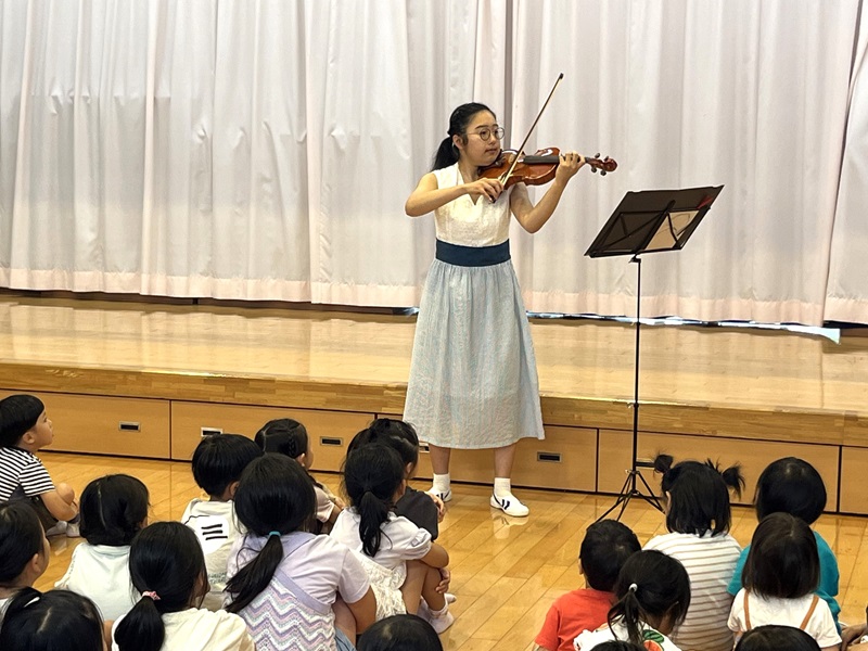 渡邊さんは、5歳のころからヴァイオリンを習っており、長期休暇の期間になると福祉施設などでヴァイオリンを演奏し、地域の方々に音楽を楽しんでもらうためのボランティア活動を続けているそうです。このたび、「今津未来園(福山市)」と「西藤保育所(尾道市)」の0歳から5歳児までの全園児を対象に、ヴァイオリン演奏によるボランティア活動を行ってきました。