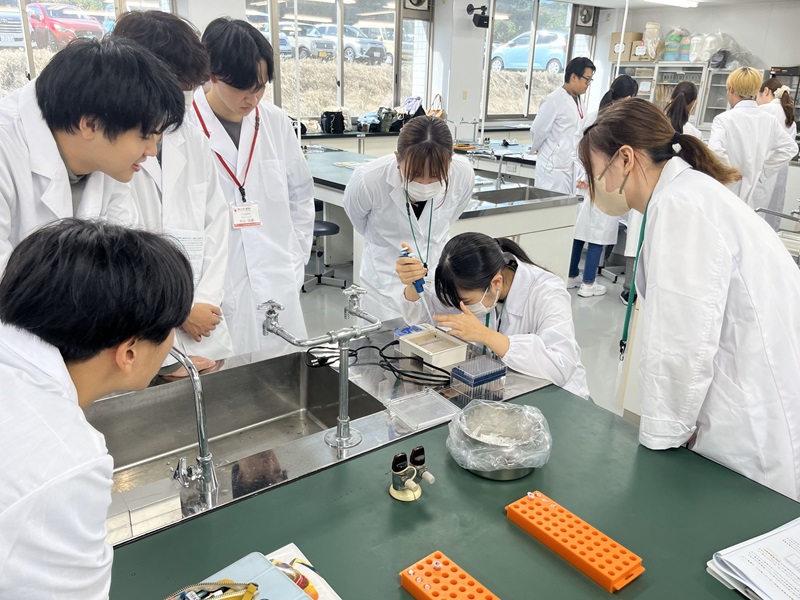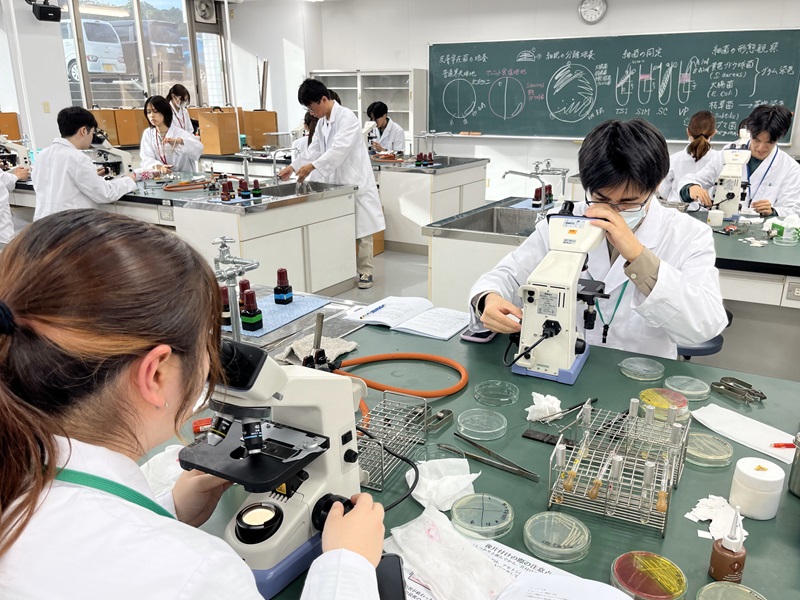 ② 微生物学分野の実習 では、主に、分子免疫生物学研究室 の教員と先輩学生たちが担当しています。微生物の分類、構造、生活史に関する基本的知識を修得し、微生物を取り扱うための基本的技能を身につけることを、目的としています。