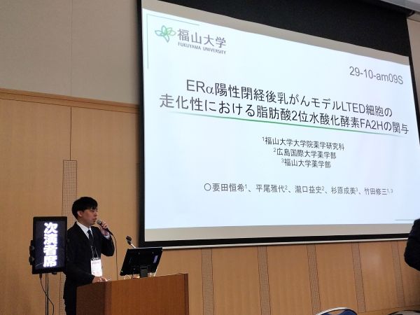 ■ ERα陽性閉経後乳がんモデルLTED細胞の走化性における脂肪酸2位水酸化酵素FA2Hの関与 [29-10-am09S] ○要田 恒希1、平尾 雅代2、瀧口 益史2、杉原 成美3、竹田 修三1,3 (1. 福山大院薬、2. 広島国際大薬、3. 福山大薬)