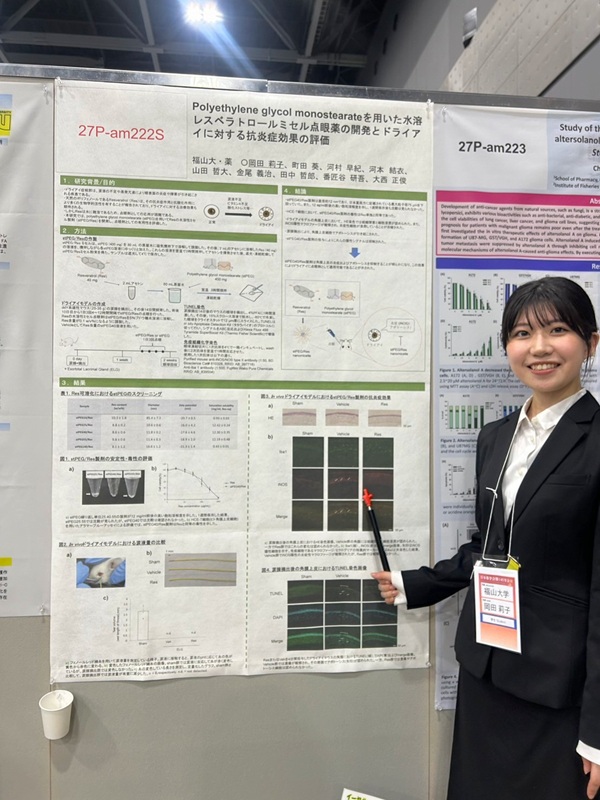 ■ Polyethylene glycol monostearateを用いた水溶性レスベラトロールミセル点眼剤の開発とドライアイに対する抗炎症効果の評価 [27P-am222S] ○岡田 莉子1、町田 葵2、河村 早紀1、河本 結衣1、山田 哲大1、金尾 義治1,2、田中 哲郎1,2、番匠谷 研吾1,2、大西 正俊1,2 (1. 福山大薬、2. 福山大院薬)