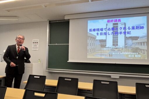 学長から一言:実務家教員として病院薬剤師の豊富な経験を活かし、薬学部在職中には教育に、研究に多大の貢献をされた前田賴伸教授の定年退職に際して開催された最終講義には、多くの同僚や教え子や関係者の皆さんが聴講に参加されました。長年にわたるご尽力とご功績に対して、私からも御礼を申し上げるとともに、前田教授のこれからの日々が幸多きものであることを願っています。