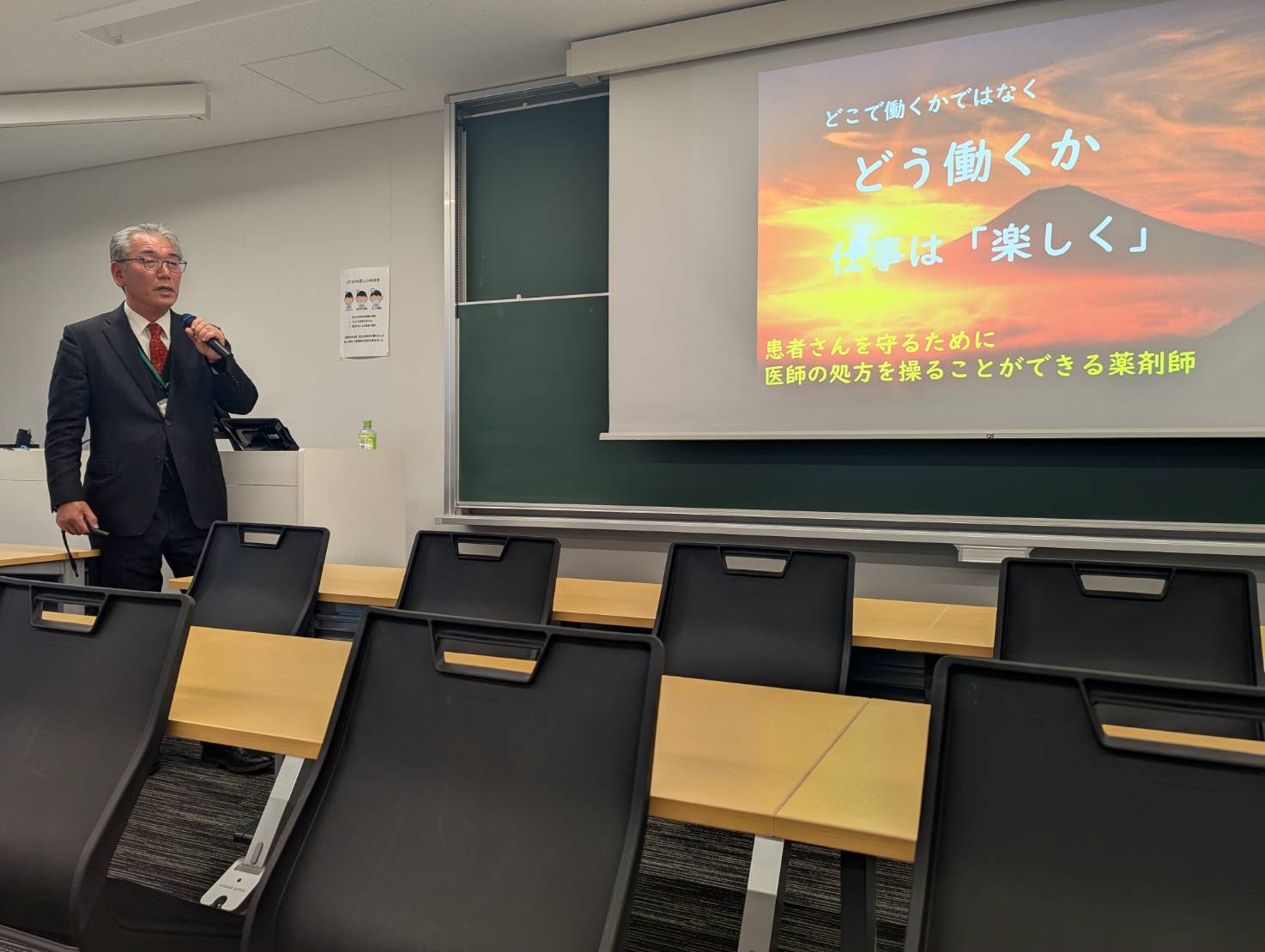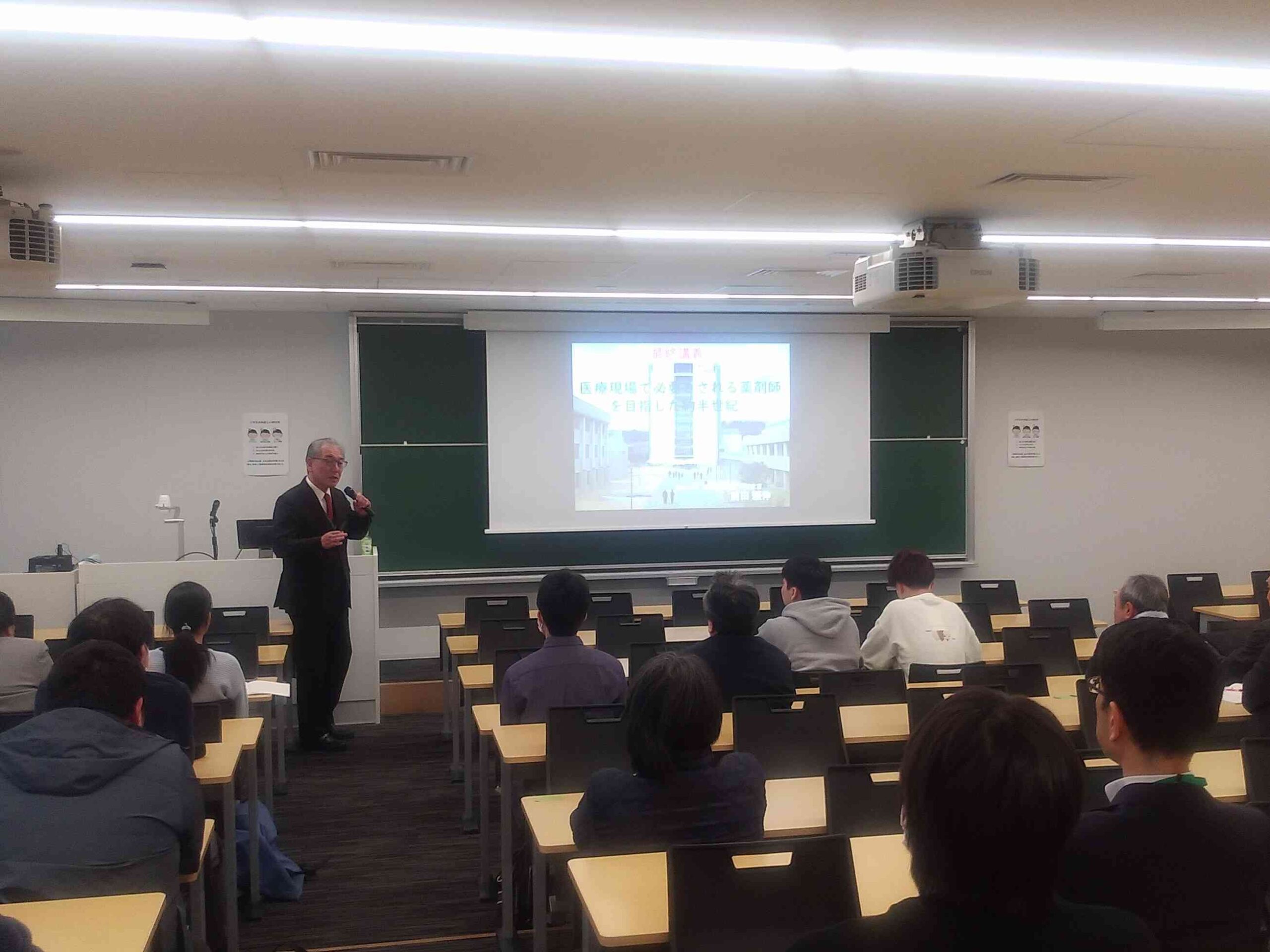 最終講義は「医療現場で必要とされる薬剤師を目指した約半世紀」をテーマとして、病院薬剤師時代の病棟薬剤業務の推進の話から始まり、薬剤師の視点からの医薬品の副作用に関する調査および研究、そして大学での教育や研究について語られました。前田教授の研究の根幹は「患者さんを守る」を第一としていることを講義を聞いて実感しました。