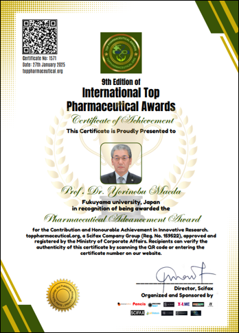前田教授は、大学を卒業後40年近く病院薬剤師として勤務され、平成31年に福山大学薬学部に着任されました。6年の在籍期間に数多くの論文を発表され、2025年1月にInternational Top Pharmaceutical Awardsの“Pharmaceutical Advancement Award”を受賞されました。