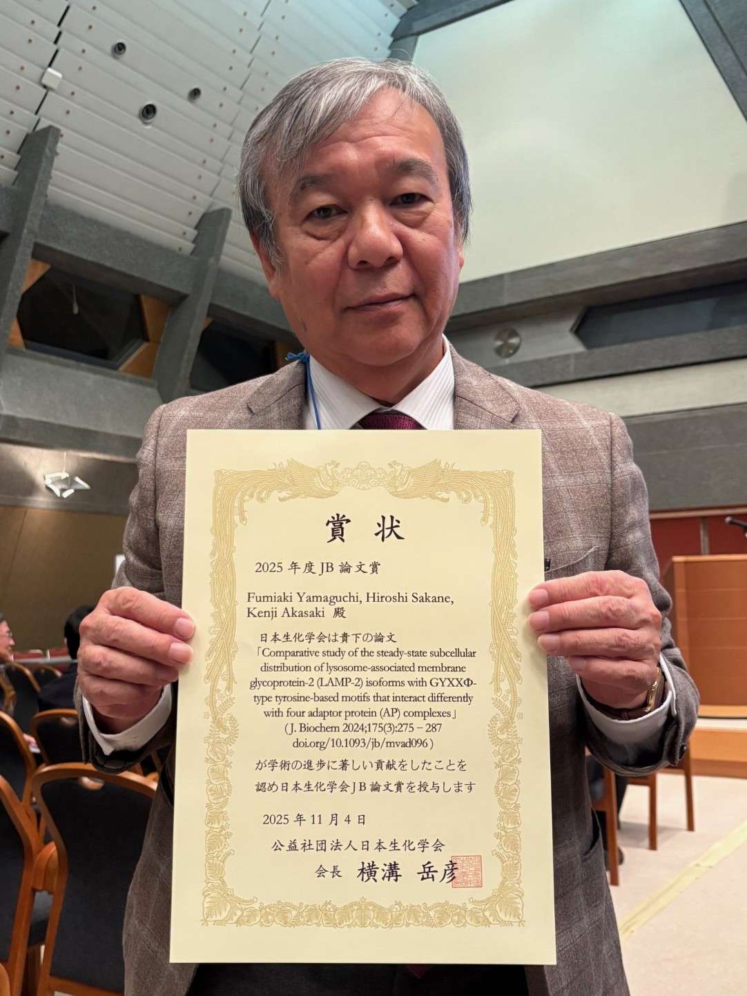 この度「JB論文賞」を受賞できたことを大変嬉しく、また光栄に思っております。今回の受賞は、福山大学に赴任して以来40年にわたり取り組んできた、リソソーム膜タンパク質LAMP-2の生化学的研究の成果が評価されたものと考えております。長年にわたり研究を共に進めてきた坂根洋准教授をはじめ、これまでご協力いただいた皆様に心より感謝申し上げます。