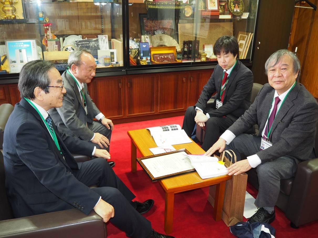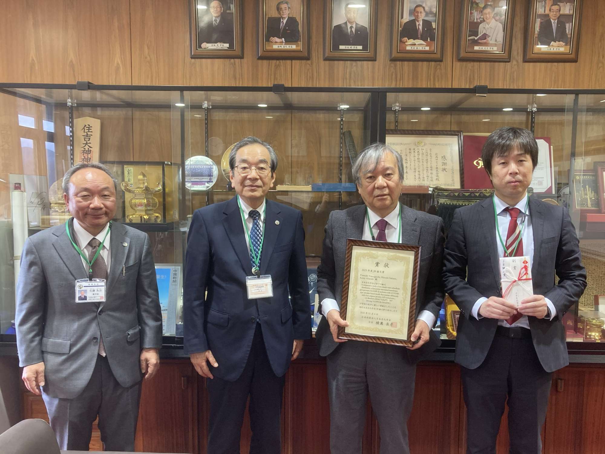 大学では、佐藤薬学部長と共に学長室を訪問し、大塚学長に受賞の報告を行いました。赤﨑教授から研究の背景や成果について説明があり、大塚学長から祝福と励ましのお言葉をいただきました。