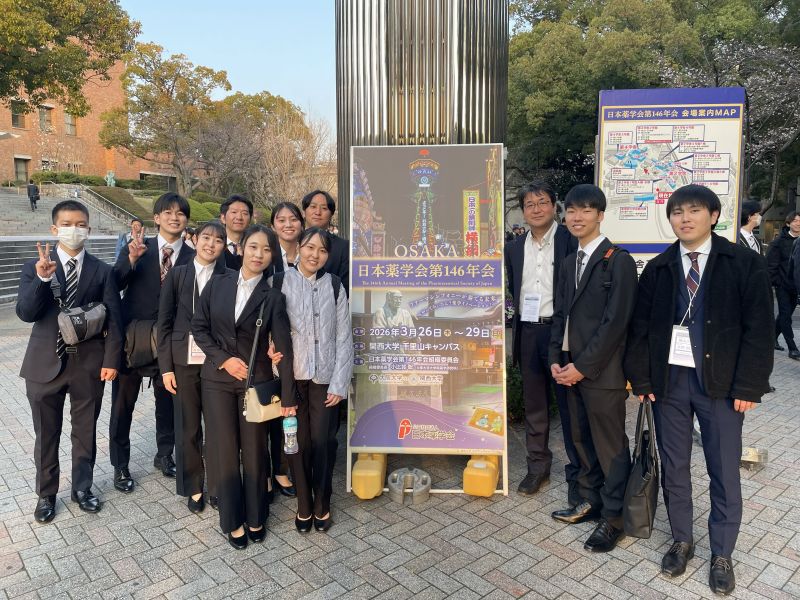 学長から一言:関西大学千里山キャンパスで開催の日本薬学会 第146年会に本学薬学部の教員・大学院生・学部生が多数参加し、40演題もの研究発表を行ったという実に頼もしい報告。他機関の研究者との共同研究も含めて、本学で薬学分野の研究が充実した研究機器を活用して精力的に展開していることの表れです。学会発表の緊張の後、関西の味を満喫する息抜きとともに、打ち解けた雰囲気の中で今後の研究展開について熱く語られたことでしょう。