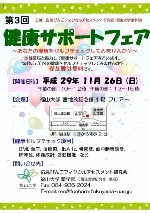 広島びんごフィジカルアセスメント研究会(福山大学薬学部)は、平成28年度より福山平成大学福祉健康学部や地域薬局と連携して、地域薬局を基盤とした健康寿命の延伸につながる健康サポートシステムの構築の一環として、『健康サポートフェア』を開催しています。来場者に対して、BMI、体組成、骨密度、運動機能、血糖値、ヘモグロビンA1c値、血圧、肺チェッカーによる肺年齢などを簡易測定機器などによるセルフチェックを行います。
