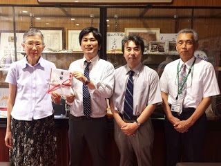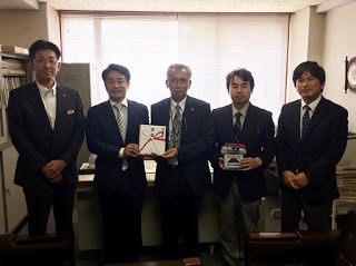 今回の寄贈にあたり来学されたのは、株式会社ネクサスの代表取締役の川上慶彰様です。また、この寄贈をコーディネートされた山陰合同銀行広島西支店の重親支店長と島田様も一緒に来学されました。