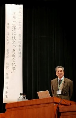 平成26年1月15日(水)福山大学学生会館にて、薬学部教授の廣瀬順造先生による教養講座『生活に役立つ身近な化学』が開講されました。 ブログメンバー、かつ廣瀬先生と同僚であるAIとMが講義の内容(と廣瀬先生について少し)をご紹介いたします。