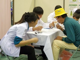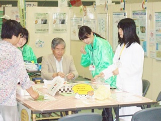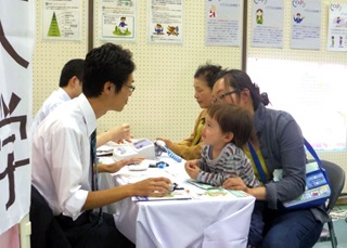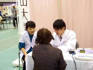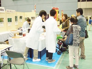 上記の活動に加えて、同会場の福山市薬剤師会ブースでは、福山市薬剤師会会長で福山大学薬学部の客員教授である 村上教授の指導のもとに、本学薬学部1年生が活躍していました。