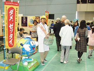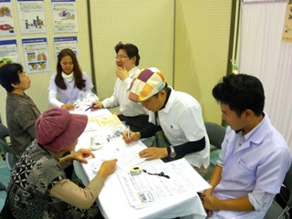 会場では、最近、生活習慣病として特に問題となっているCOPD(慢性閉塞性肺疾患)の啓発活動を行いました。 ポスター展示、リーフレット配付に加えて、呼吸チェックアンケートの実施およびハイチェッカーによる肺年齢の測定を行いました。 アンケートの内容には、「タバコを吸っていますか? 咳は痰が出ることがありませんか? 息切れしませんか?」などの項目が含まれています。