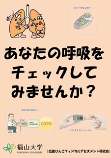 福山大学薬学部の教員で組織されている「広島びんごフィジカルアセスメント研究会」は、「あなたの肺年齢は!あなたの呼吸をチェックしてみませんか?COPDとは?」をテーマに参加しました。 また、9月の学長室ブログ「コンケン大学(タイ)薬学生の日本での実務実習を支援しています!」で紹介されたコンケン大学薬学部6年生の3名も実務実習の一環として参加しました。