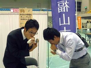 実際の来場者による「肺年齢」測定の様子です。 スタッフによる力強い励ましが必須です。