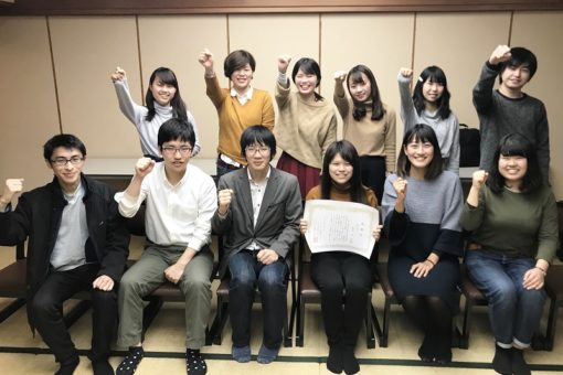 今回、「広島県ヤング薬物乱用防止指導員」として任命された学生たちは、日ごろは、石津 隆教授(生体機能解析学研究室)を顧問として薬学部2、3年生の12名で構成される劇団「危防」のメンバーとして活動しています。ちなみに、「危防(きぼう)」というのは危険ドラッグ防止の略で、希望へとつなぐことを意味しています。