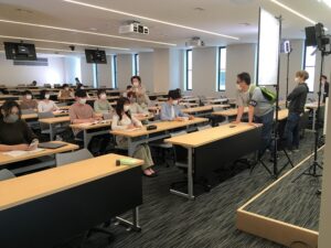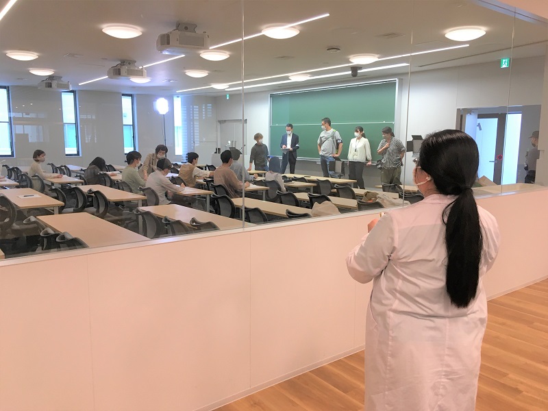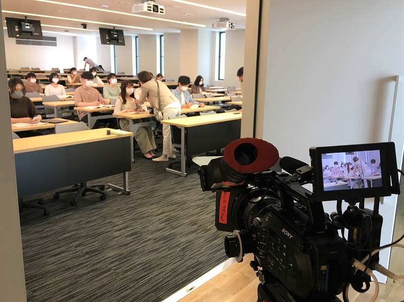 2階の講義室で講義を受けているイメージです。井上敦子薬学部長が、撮影の様子を見守っています。