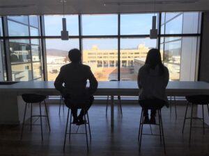 11階のカフェテリアがある展望スペースで、くつろいでいるイメージです。
