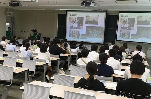 「病態生理・ゲノム機能学研究室」の配属学生の角南さん(5年)が、高校時代の大学選び(福山大学薬学部を選んだ決め手)や大学に入ってからの学生生活、寮生活、研究室のイベントについて、笑いをまじえながら話してくれました。高校生は普段聞くことのできない在学生の話に対し、集中して耳を傾けていました。